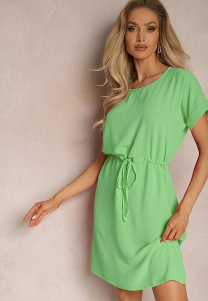 Jasnozielona Sukienka Mini z Krótkim Rękawem Ściągana w Pasie Troczkami Bellisant