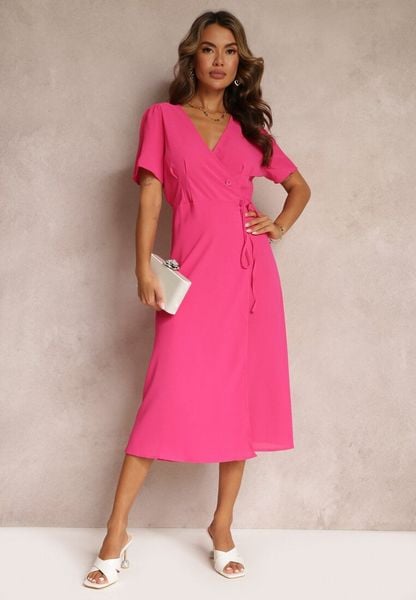 Fuksjowa Sukienka Midi z Kopertowym Dekoltem i Wiązaniem w Pasie Elisanu