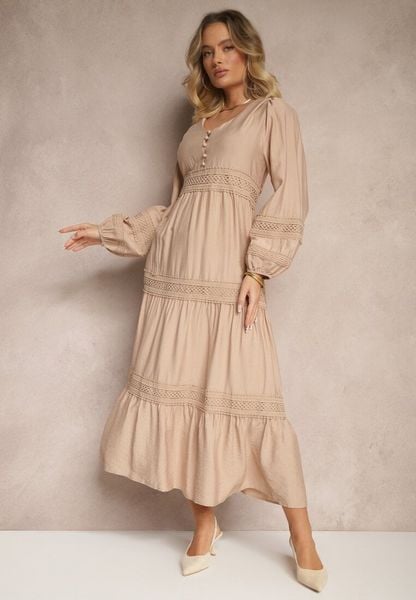 Ciemnobeżowa Rozkloszowana Sukienka z Wiskozy z Koronkowymi Wstawkami Nalanieth