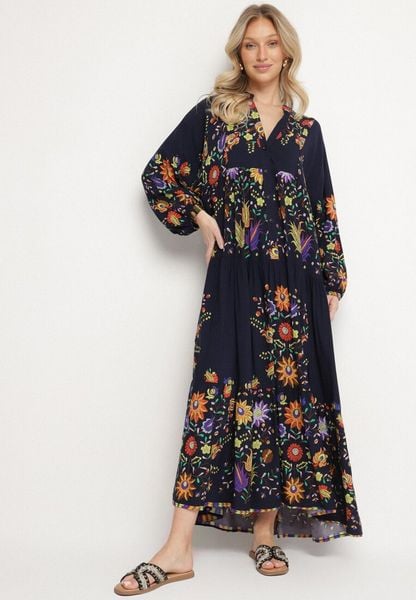 Granatowa Wiskozowa Sukienka o Rozkloszowanym Kroju w Kwiaty Cleolia