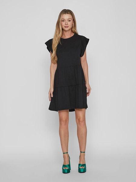 Czarna Sukienka z Krótkim Rękawem i Ozdobnymi Falbankami o Rozkloszowanym Kroju Vetesa