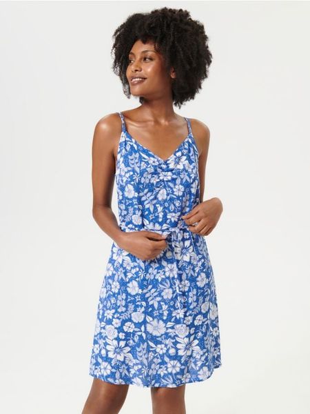 Zwiewna sukienka na ramiączkach z motywem kwiatów, uszyta z delikatnej dla skóry wiskozy.