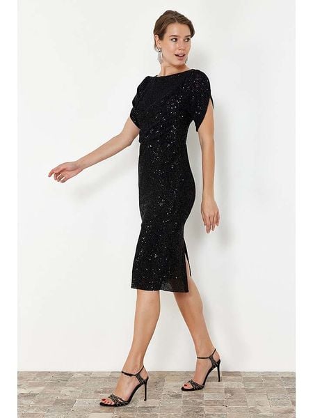 – dekolt: łódka- zapięcie: suwak na plecach- detale: cekiny- dolny brzeg: z rozcięciem- krój: wąski- look: jednokolorowy
