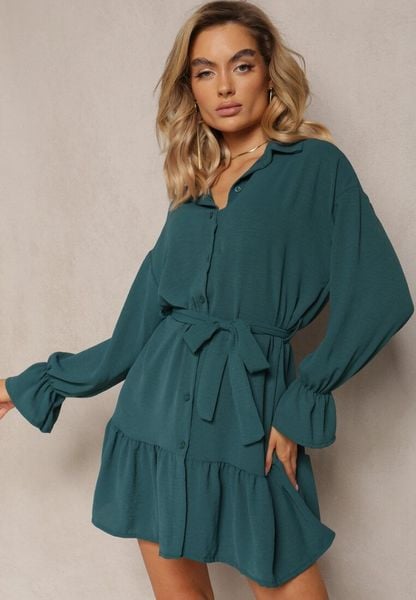 Ciemnozielona Koszulowa Sukienka Mini z Falbanką i Wiązanym Paskiem Blisotta