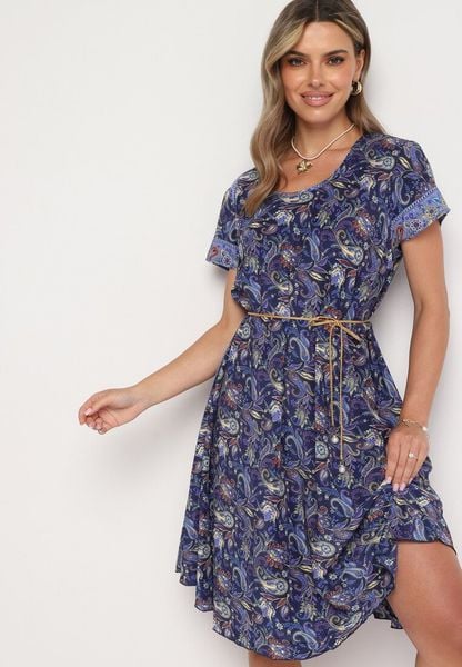 Niebieska Wiskozowa Sukienka Rozkloszowana z Wiązaniem we Wzór Paisley Mreadia