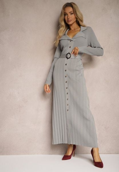 Szara Plisowana Sukienka z Wiskozowej Dzianiny z Kieszeniami i Paskiem Cetida