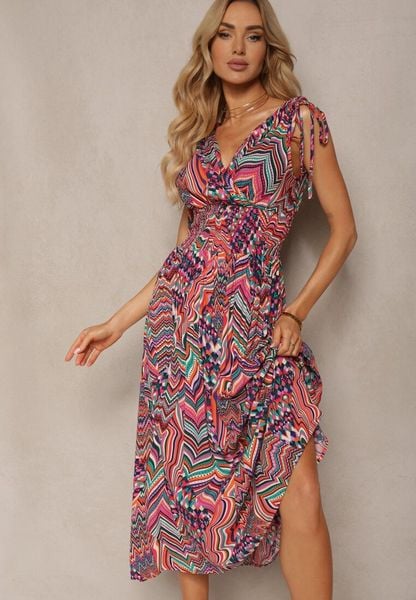 Zielono-Różowa Boho Sukienka o Rozkloszowanym Kroju z Dekoltem w Serek i Gumką w Pasie Heteri