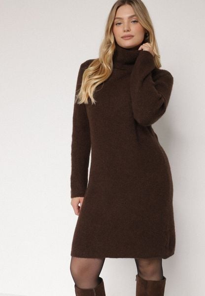 Brązowa Sukienka Sweterkowa z Golfem z Wiskozą i Wełną Fedamira