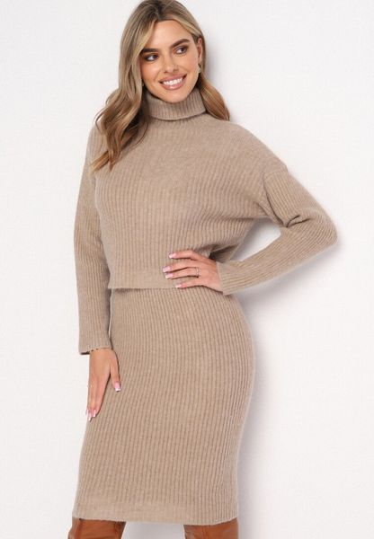 Ciemnobeżowy Komplet Dzianinowy z Wełną Sweter z Golfem i Ołówkowa Spódnica Falovira