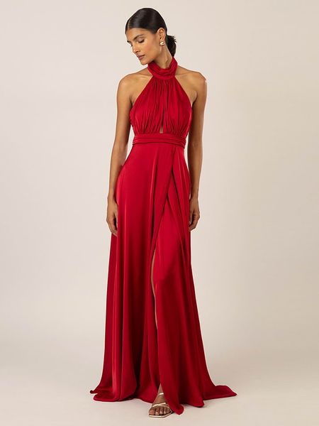 Czerwona Satynowa Sukienka Asymetryczna Koktajlowa z Wycięciami w Talii i Drapowaniem Ciafisa