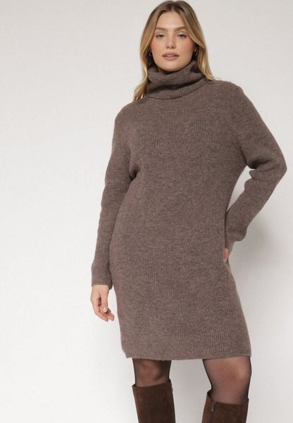 Jasnobrązowa Sukienka Sweterkowa z Golfem z Wiskozą i Wełną Fedamira
