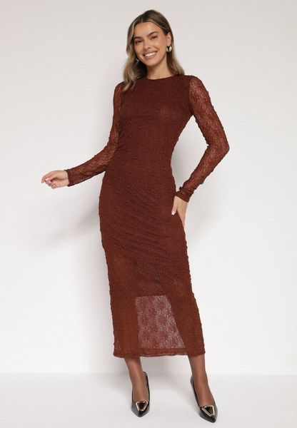 Brązowa Dopasowana Sukienka Koronkowa z Długim Rękawem Zenika