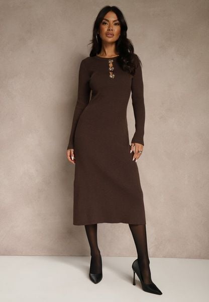 Brązowa Dopasowana Sukienka z Prążkowanej Dzianiny z Wiskozą z Aplikacjami Tusmana