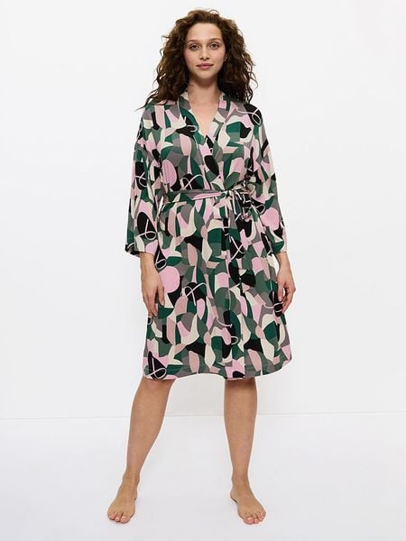 – dekolt: V- długość rękawa: 7/8- zdejmowany pasek: tkanina- dolny brzeg: z rozcięciem- krój: prosty- wzór: na całości