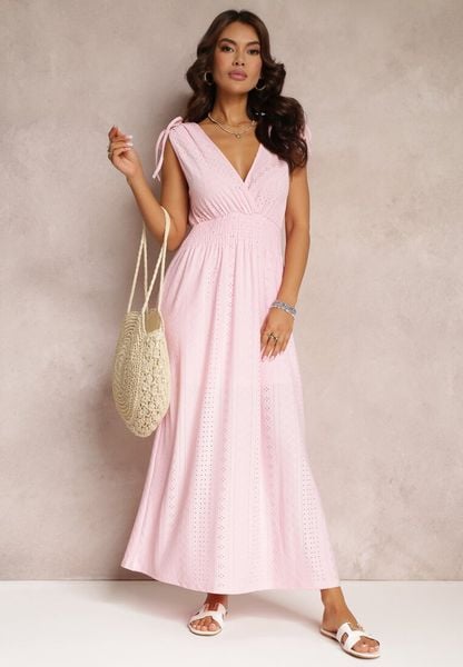 Różowa Sukienka Długa o Rozkloszowanym Fasonie z Kopertowym Dekoltem Saliusa