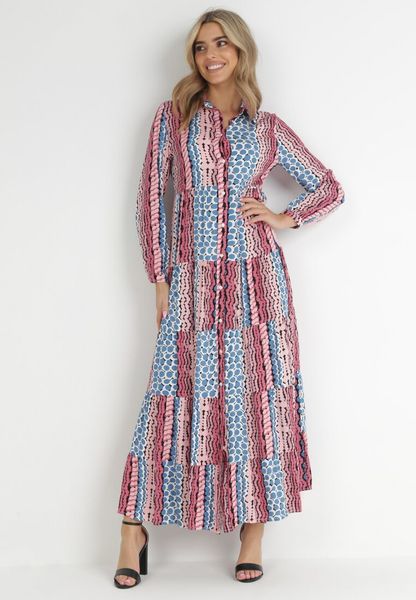 Niebiesko-Różowa Rozkloszowana Sukienka Koszulowa Maxi Jayin