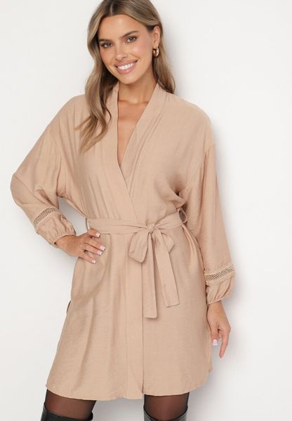 Beżowa Wiskozowa Sukienka Kimono z Kieszeniami i Ozdobnymi Ażurowymi Wstawkami Salanora