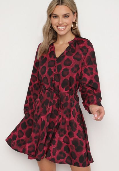 Bordowa Rozkloszowana Sukienka w Panterkę z Guzikami i Wiązaniem w Talii Morila