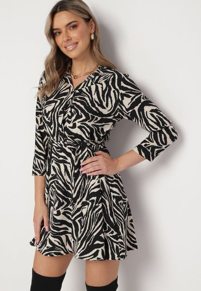 Czarno-Biała Sukienka Mini ze Zwierzęcym Printem i Wiązanym Paskiem w Talii Crossie