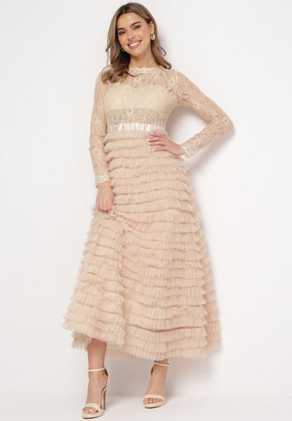 Jasnobeżowa Maxi Sukienka Rozkloszowana z Koronkową Górą i Tiulowymi Falbankami Firina