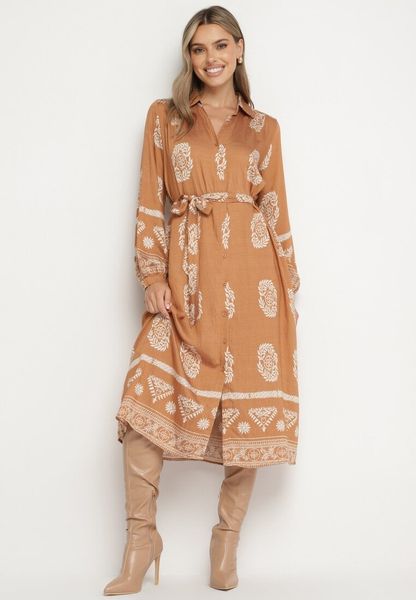 Jasnobrązowa Koszulowa Sukienka Ozdobiona Ornamentalnym Wzorem z Wiązanym Paskiem Roriola