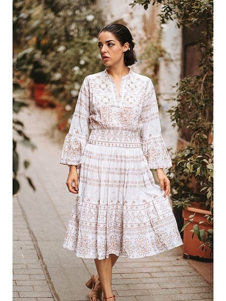 – czysta bawełna- dekolt: z rozcięciem- krój rękawów: rozszerzany do dołu- talia: marszczona- krój: taliowany – wzór: na całości