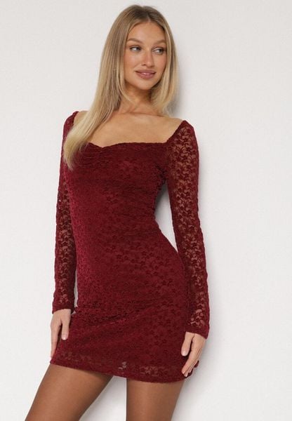 Bordowa Koronkowa Sukienka o Dopasowanym Kroju z Kwadratowym Dekoltem Tiwedesa