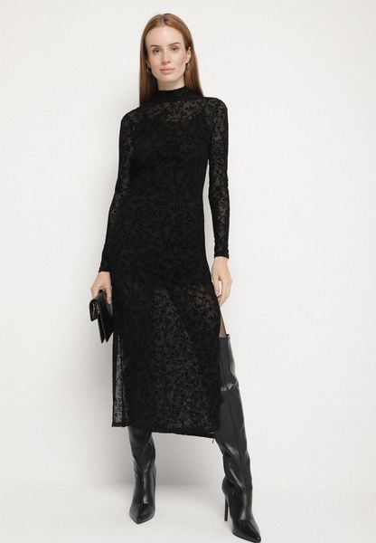 Czarna Dopasowana Sukienka z Siateczki z Wiskozą w Moro z Rozcięciami Emeloraine