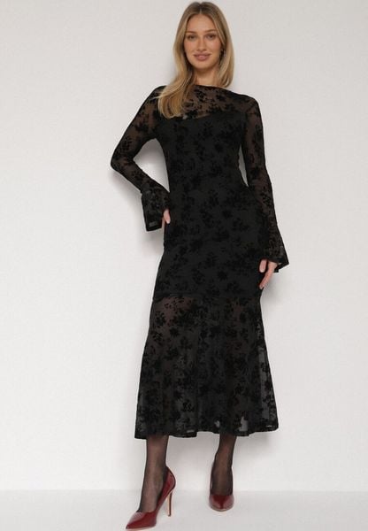 Czarna Siateczkowa Sukienka Wieczorowa VICES z Welurowym Wzorem Jilney
