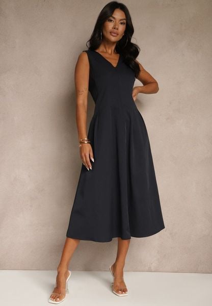 Granatowa Rozkloszowana Sukienka z Dekoltem w Kształcie Litery V Agilia