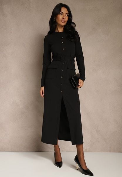 Czarna Koszulowa Sukienka z Wiskozą Ozdobiona Paskiem i Guzikami Vetionna