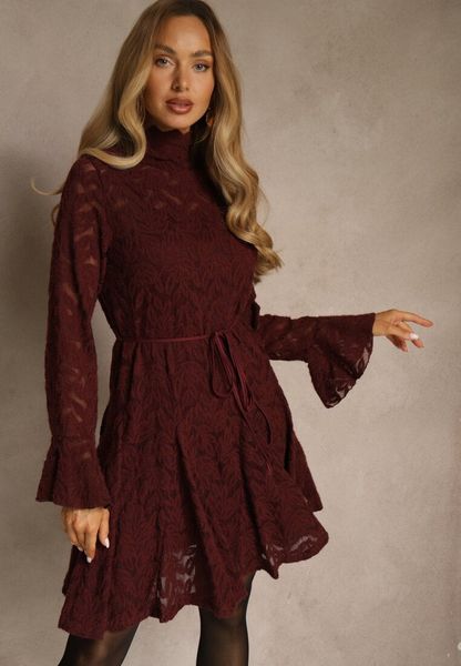 Bordowa Sukienka ze Stójką z Koronki Zdobiona Wiązaniem w Talii i Falbanami Elarassa