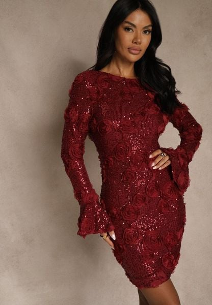 Bordowa Dopasowana Sukienka Ozdobiona Cekinami i Kwiatami 3D Raweda