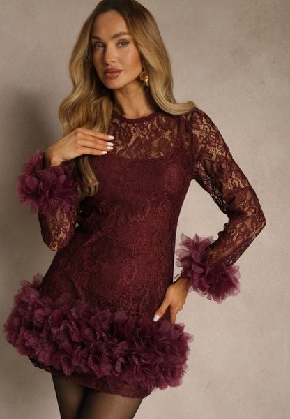 Bordowa Dopasowana Koronkowa Sukienka Koktajlowa z Tiulowymi Aplikacjami Kretalia