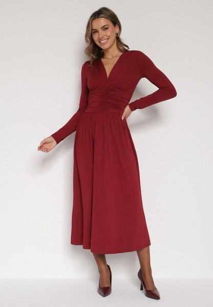 Bordowa Marszczona Sukienka Taliowana z Wiskozą z Dekoltem V i Długim Rękawem Emirie