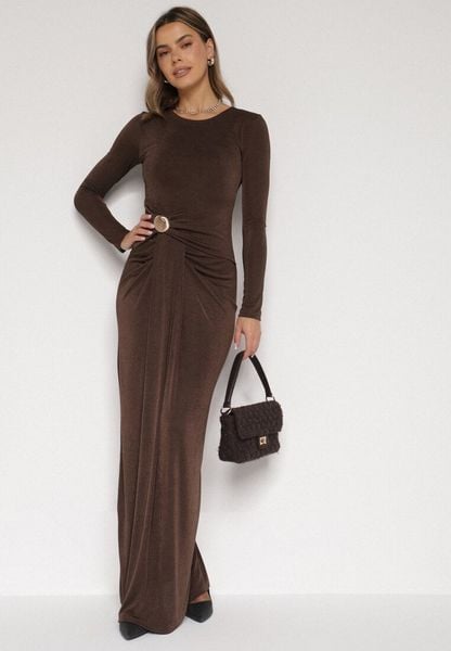 Brązowa Elegancka Sukienka Zdobiona Marszczeniem i Metaliczną Aplikacją Raselia