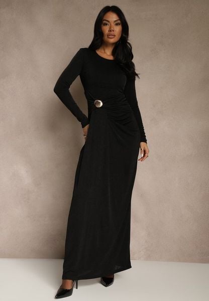 Czarna Marszczona Sukienka Koktajlowa Zdobiona Aplikacją w Talii Siweda