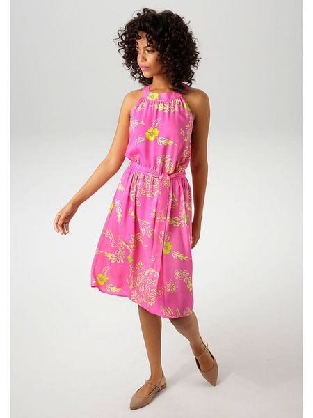 – czysta wiskoza- ramiączka: na szyję- dekolt: okrągły- zapięcie: guzik na plecach- szlufki na pasek: tak- zdejmowany pasek: tkanina- krój: prosty- wzór: kwiatowy