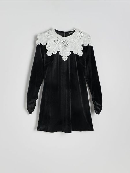 Sukienka o rozkloszowanym kroju wykonana z welurowej tkaniny.