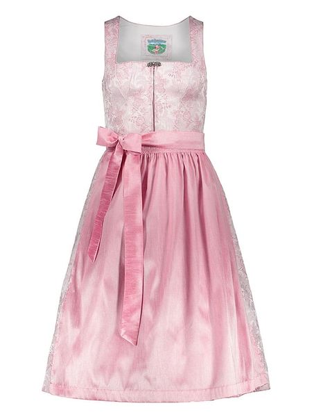 Dirndl:- dekolt: balkonetka- zapięcie: zamek błyskawiczny z przodu- boczne kieszenie przy spódnicy: tak- detale: ozdobna zakładka- wzór: kwiatowyFartuszek:- tasiemka fartuszka: szeroka- mocowanie guziczkiem- look: jednokolorowy
