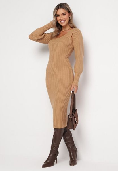Beżowa Dzianinowa Sukienka Midi z Trójkątnym Dekoltem i Bolerkiem z Bufiastymi Rękawami Vorteia