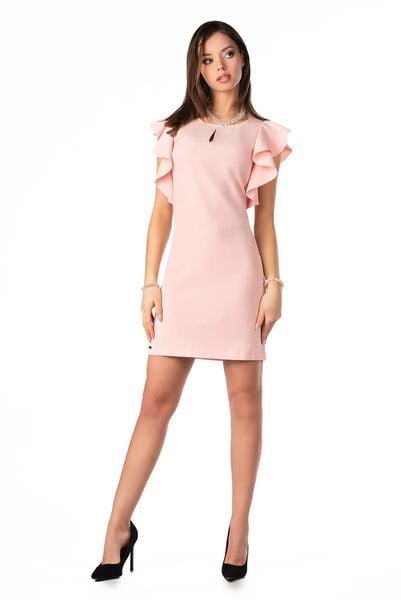 Różowa Ołówkowa sukienka z Falbankami na Ramionach