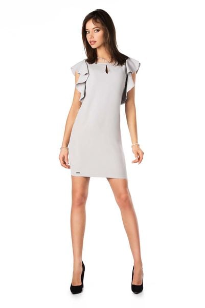 Szara Ołówkowa sukienka z Falbankami na Ramionach