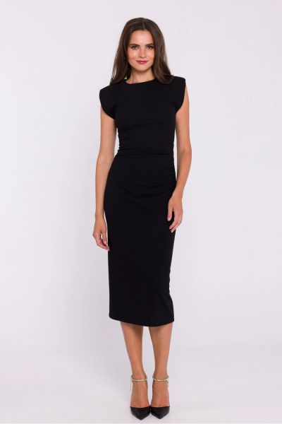 Elegancka, mocno dopasowana sukienka za kolano z poduszkami na ramionach, bez rękawów. Idealna sukienka wizytowa oraz do pracy