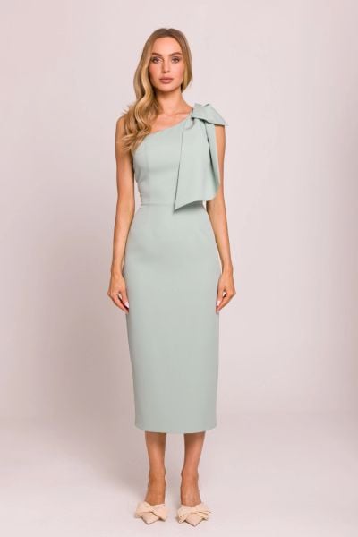 Elegancka sukienka ołówkowa na jedno ramię z kokardą miętowa
