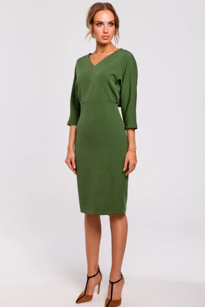 Sukienka ołówkowa zbluzowana góra i dekolt V zielona