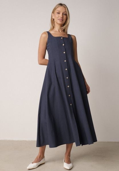 Granatowa Rozkloszowana Sukienka z Bawełną Wiskozą i Guzikami Appeia
