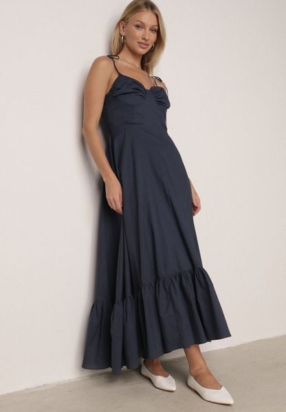 Granatowa Bawełniana Sukienka o Rozkloszowanym Kroju na Wiązanych Ramiączkach Milalisa