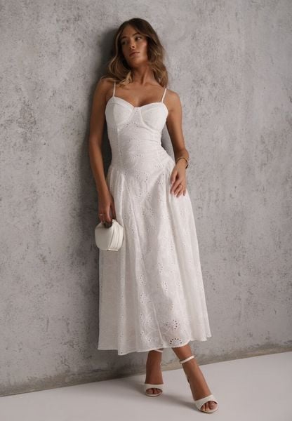 Biała Ażurowa Sukienka z Bawełny o Rozkloszowanym Kroju na Ramiączkach Cheriny