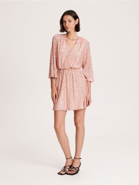 Sukienka o kopertowym fasonie, uszyta z dzianiny z cekinami.